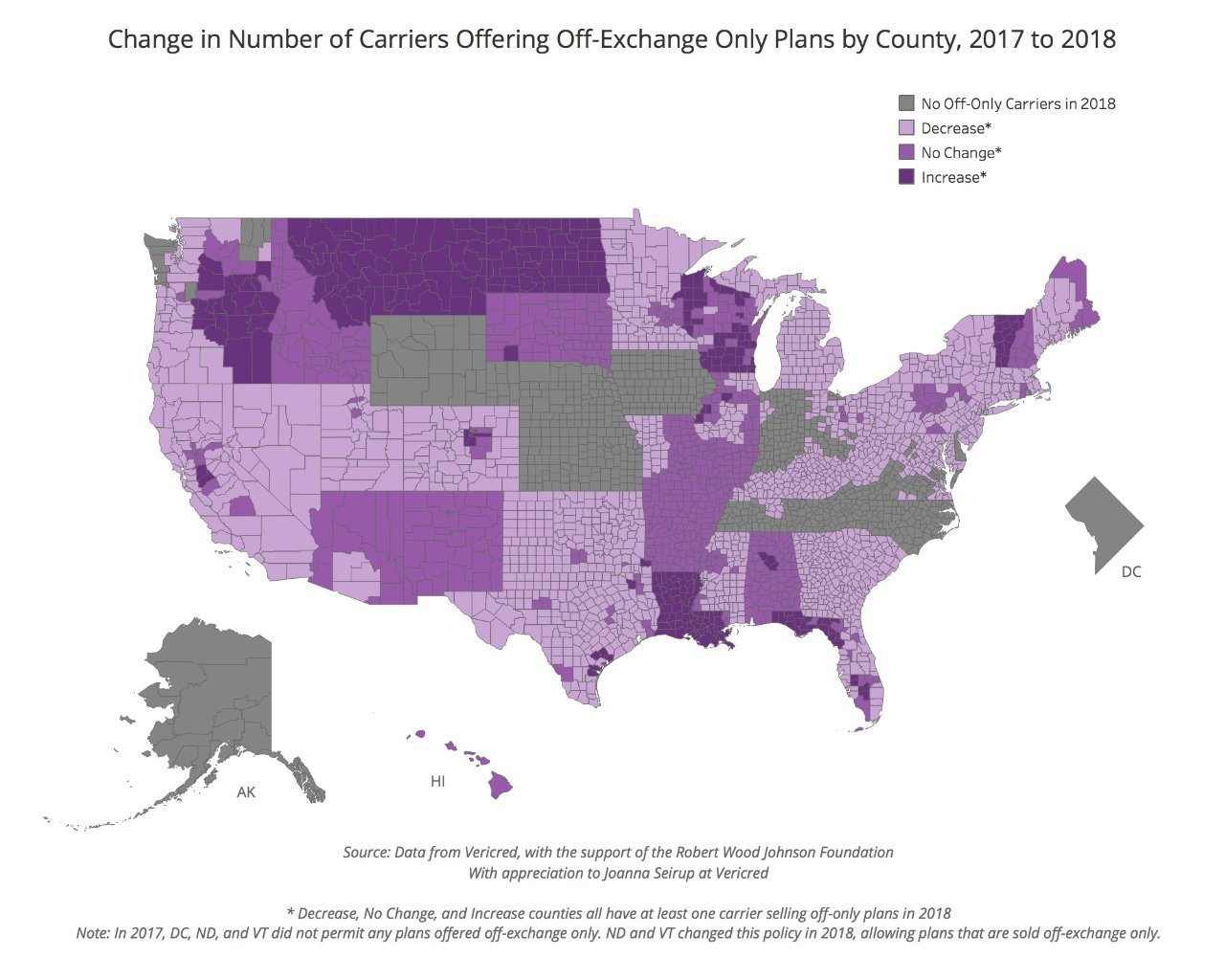 ** Washington, D.C., Vt., and N.D. deliberately eliminated their off-exchange market in 2014, although N.D. and Vt. did permit some off-exchange sales in 2018.