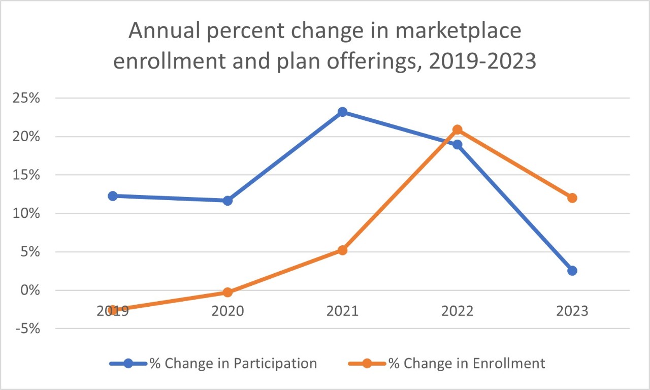 The ACA marketplace was designed with the hope that it would foster not just competition but also new entry into the health insurance market. An early attempt to seed competition by encouraging the creation of co-ops was a well-known debacle, with headwinds compounded when federal risk corridor payments were blocked. A recent article on one of the few survivors highlighted the high rate of mortality among this unfortunate cohort of plans. Yet other new entrants have been attracted by the opportunity presented by the marketplace, and a number of new health plans have come into existence over the past decade. Many are no longer with us, and it is worth noting that almost all of the notable participation reduction this year has been concentrated among relatively new “insurtech” companies—Bright Health, Friday Health Plans, and Oscar. Many obituaries have been written for these companies, who generally lack scale and favorable provider contracts. In most cases, holes left by these market exits have been filled by large, for-profit national companies. Other regional plans are generally not increasing their presence in the marketplace, and some are reducing their footprint or exiting.